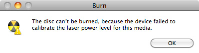 Tonight I went to update my copy of Diskwarrior to version 4.4. That required me to download an updater from the Alsoft website and then I needed to insert my original DVD and once it copied and modified it, I needed a blank DVD to burn the updated DVD. I’ve done it before so I didn’t really think twice. That is, until it wouldn’t burn on my MacBook Pro. I tried three different brands of DVDs and got the same result. I then decided to burn straight from the Mac OS X operating system and got this error message:
